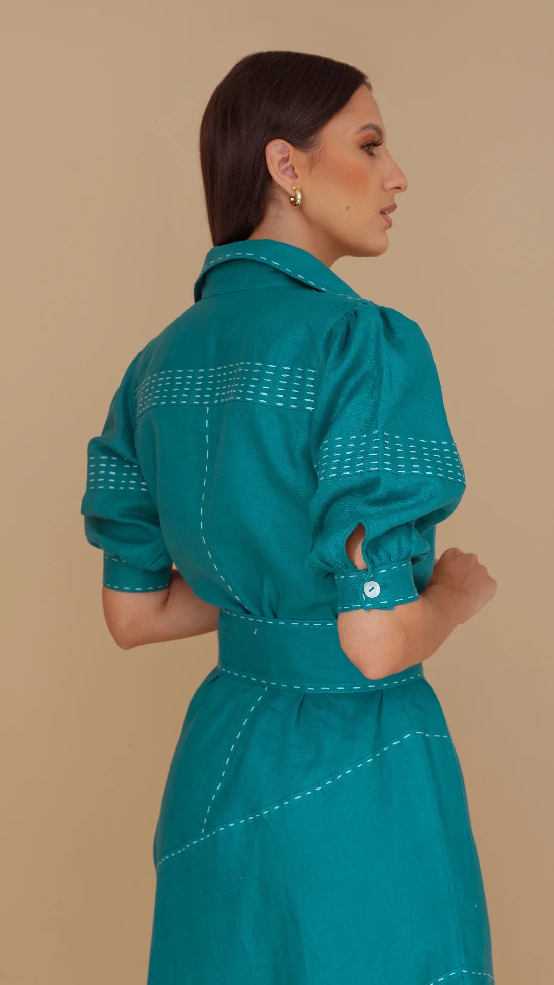 Shirt dress with slanted diagonal cuts and hand-stitched details on the dress and sash. 3/4 sleeve