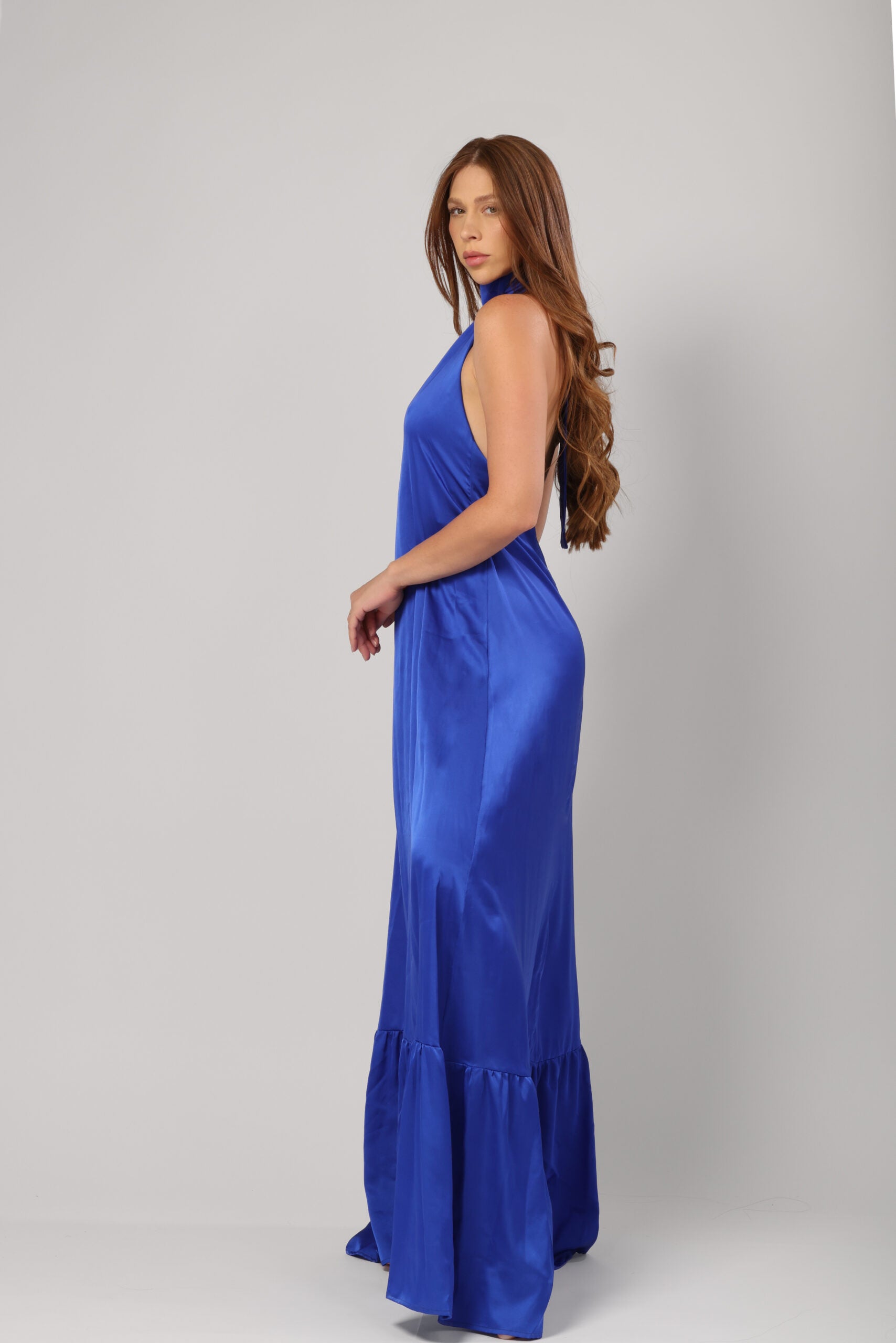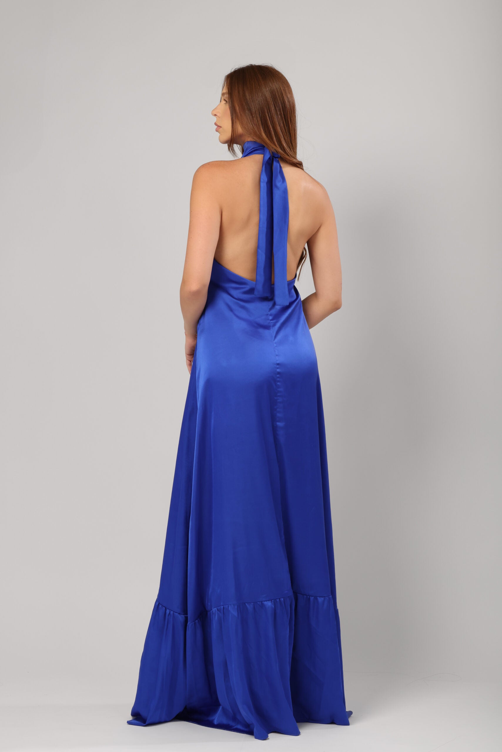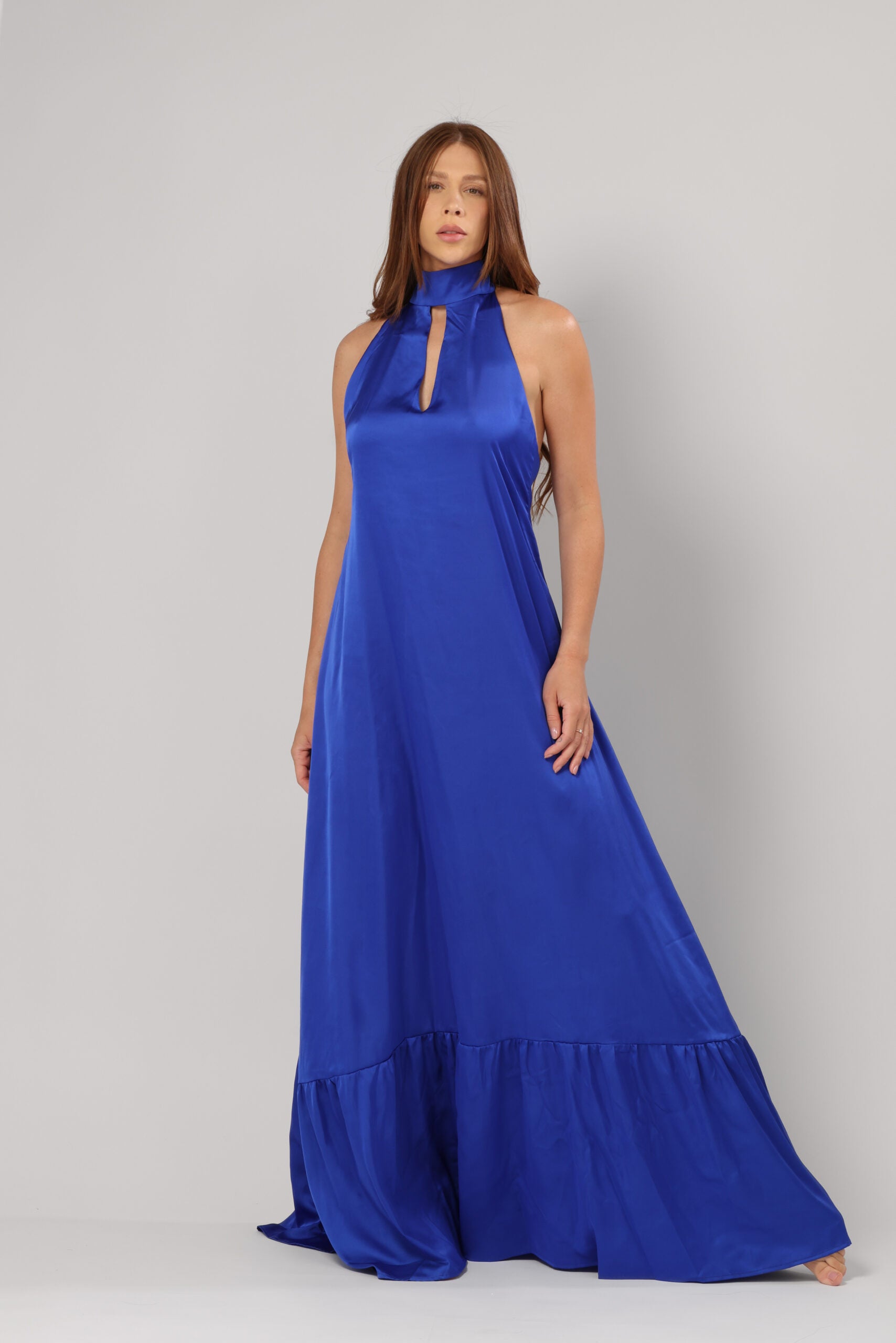 The high neckline with a delicate keyhole cut-out adds a modern twist, while the halter-style shoulders highlight your décolletage elegantly. A subtle gathered detail at the hem creates soft volume, making it perfect for twirling on the dance floor.