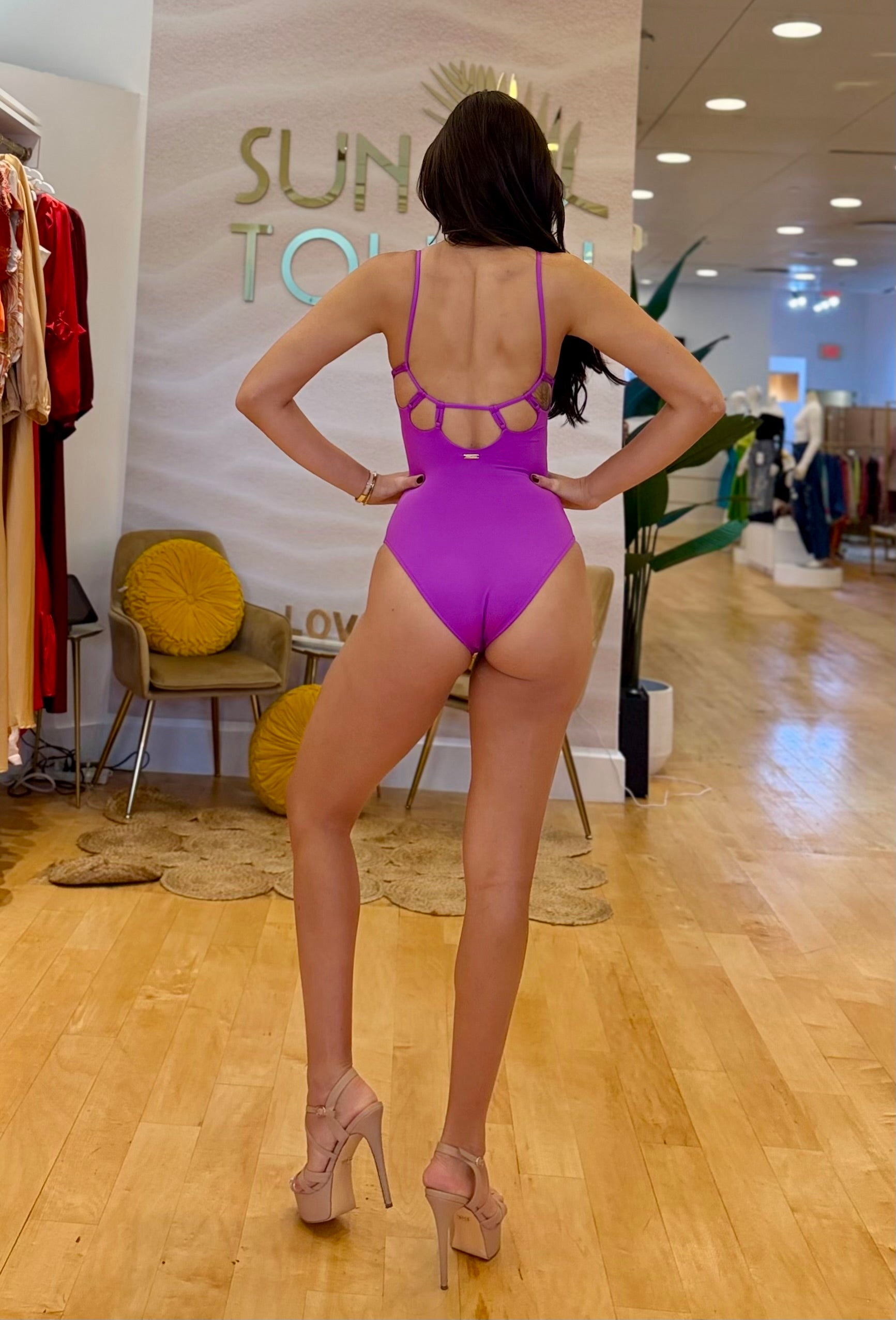 Slip into effortless elegance with this stunning one-piece from our Vacance SS25 collection. Designed in a striking fuchsia hue that celebrates sun-kissed days, this swimsuit features delicate adjustable straps and a subtly ruched neckline that enhances your natural shape.
