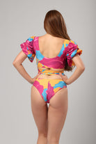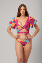 From Drop 3 of the Vacance Collection, this two-piece merges dramatic resort style with tropical ease. The top features voluminous puff sleeves and a deep neckline with a flattering wrap-around tie that sculpts the waist. Crafted in our vibrant floral print, the exaggerated sleeves add a romantic, high-fashion twist to your swim look.