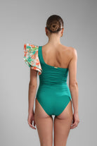 Vestido de baño de una pieza unicolor con hombro descubierto y manga a un lado con volumen gracias a diseño con arandela en capas estampada. Silueta ceñida al cuerpo con ajuste perfecto gracias a su construcción , Elaborado en textil elástico de tacto suave