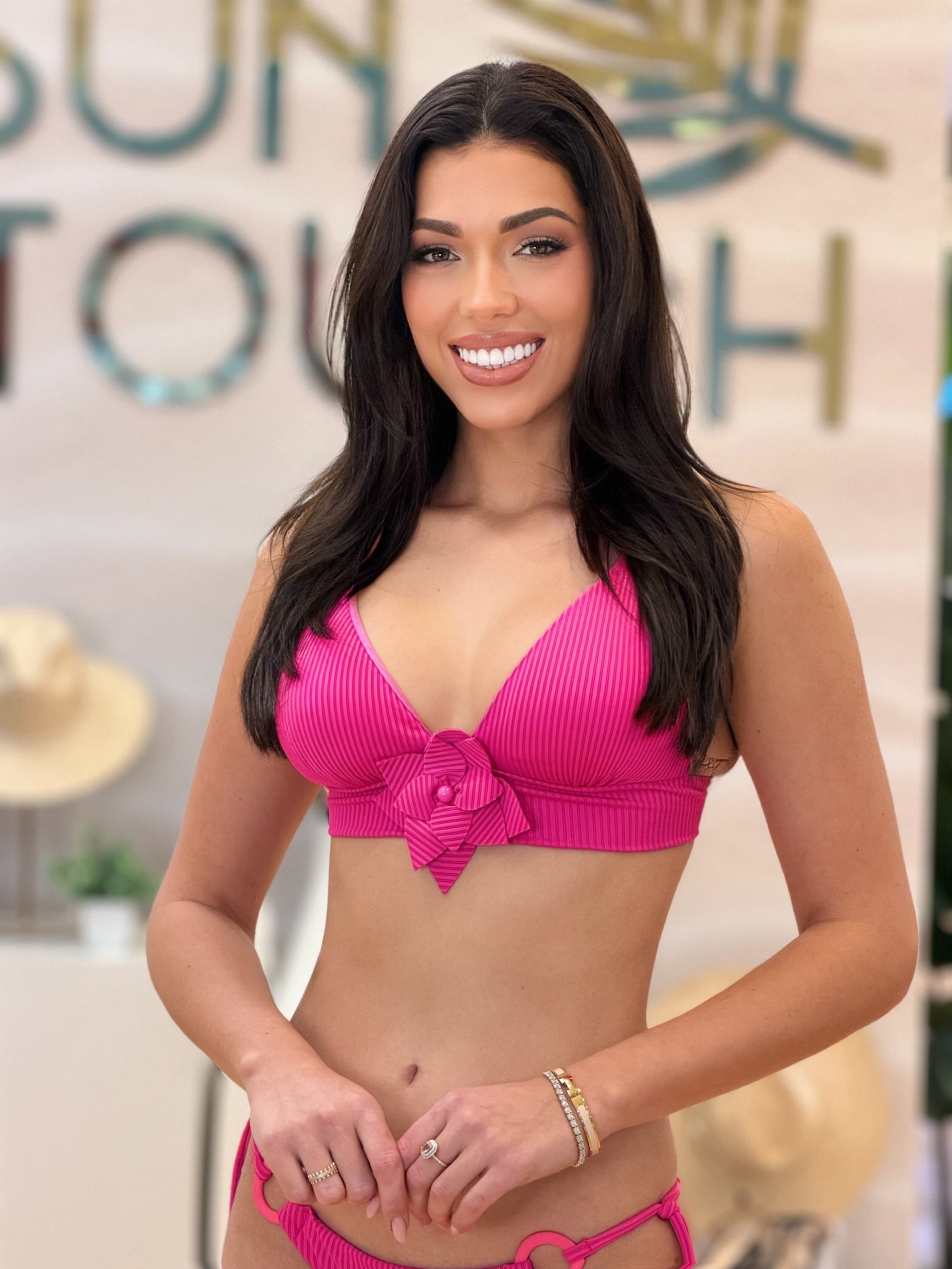 Romantic and bold , This two-piece features a statement rose detail at the center of the top.