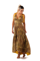 Long dress printed silk with gold color strips, wide skirt with horse tail ending.