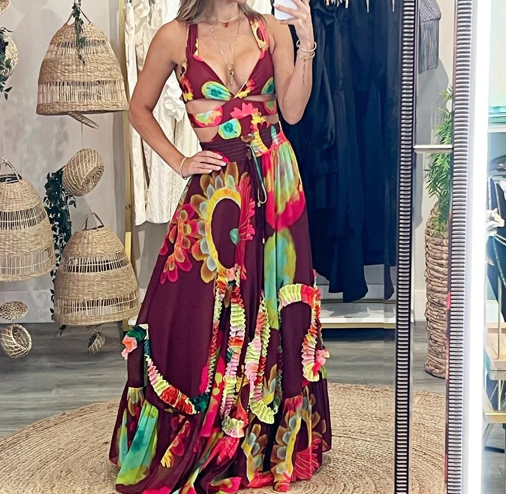 Cut-off one-piece printed swimsuit, a seasonal must-have with braided artisan work on the back. Adjustable tunnel back for versatility and comfort.